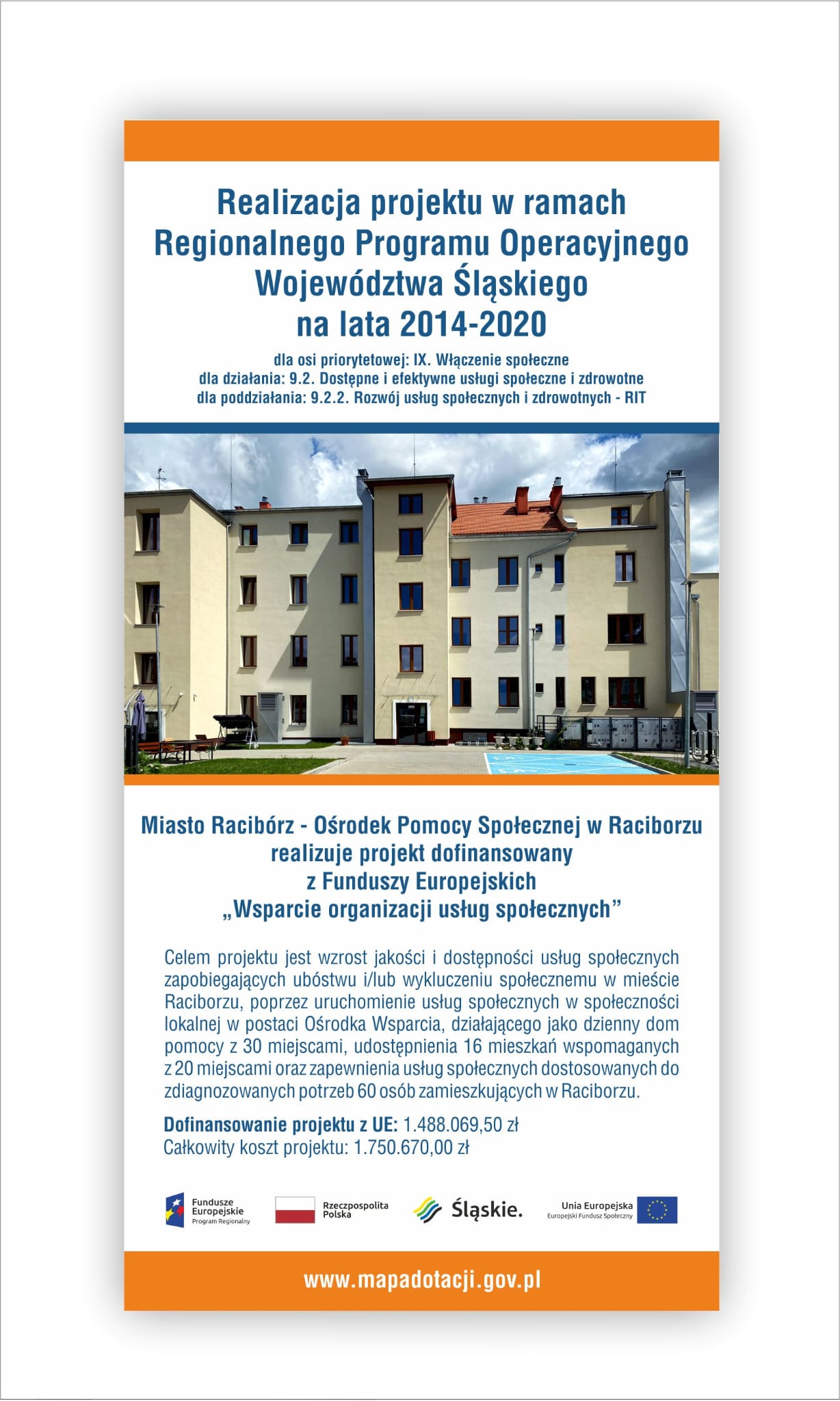 Pragniemy poinformować, że w związku z realizacją projektu pn. „Wsparcie organizacji usług społecznych” współfinansowanego ze środków Unii Europejskiej w ramach Europejskiego Funduszu Społecznego, w ramach Regionalnego Programu Operacyjnego Województwa Śląskiego na lata 2014-2020, oś Priorytetowa IX: Włączenie społeczne, Działanie: 9.2 Dostępne i efektywne usługi społeczne i zdrowotne, Poddziałanie 9.2.2. Rozwój usług społecznych i zdrowotnych - RIT,